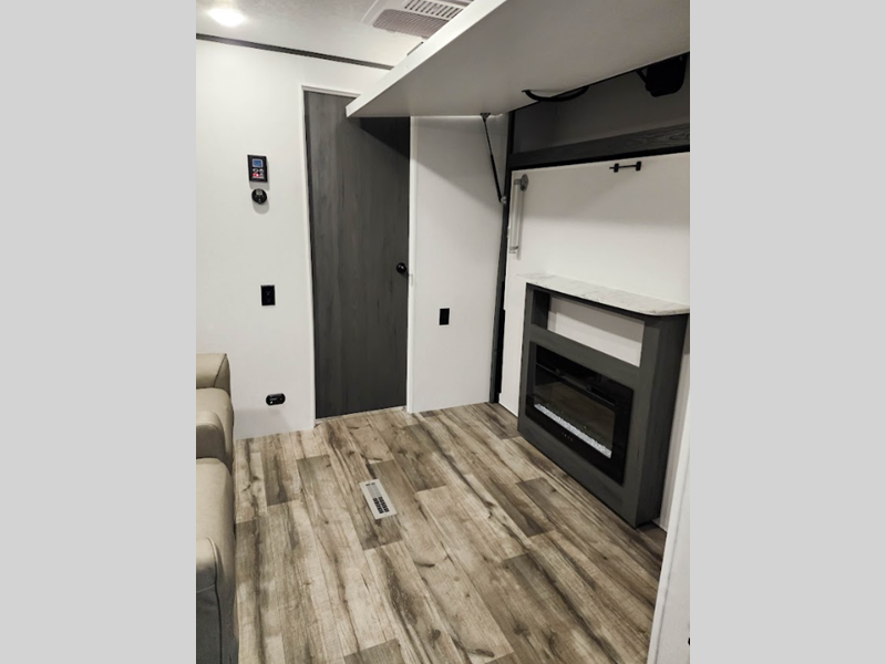 Each model is built with a heated and enclosed underbelly and smooth front metal for added protection against the elements. There is also a 100-watt solar panel outside, along with a power awning with LED lights and fender skirts. You'll love the 6' 10" height inside, along with pleated night shades and seamless thermofoil countertops in the kitchen.